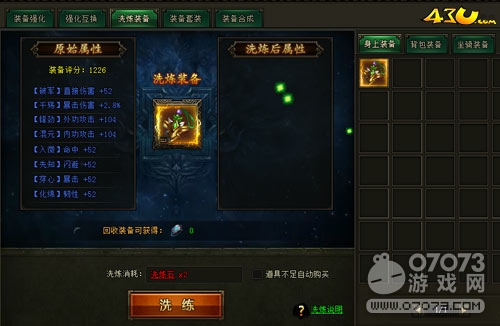 如果把两件装备强化等级互换,互换后的强化概率依然保留,当强化等级高于上限是无法互换的哦!想要改变装备极品属性条数、类型和数值就使用洗练装备吧!洗练分数越高回收装备获得的洗练石也就越多!橙色品质装备可拥有5-8条的附加属性哦!
