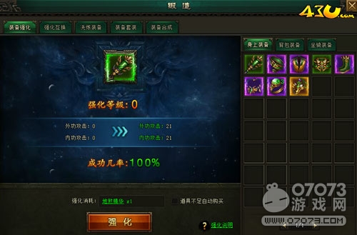 43u《万剑》锻造系统分为装备强化、强化互换、洗炼装备、装备套装和装备合成五个部分,装备品阶越高上限越高,强化也是有几率失败的,装备强化还可以转移给其他的装备并且是没有损失的哦!