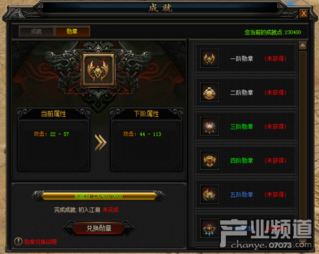 当玩家完成初入江湖里的所有成就时便可兑换所对应的勋章,成就完成的越多兑换的勋章等级越高,玩家获得属性加成也越高。