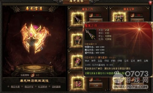 玩家可将各种屠龙装备,佩戴在角色的副装槽里,这些装备不会与普通装备发生冲突。其中,屠龙护腕、屠龙宝戒两件装备,可同时佩戴两件。玩家身上若能集齐10件屠龙装备,可以激活无双伤害减免30%的效果。玩家可获得屠龙装备后,还能对装备进行进阶操作,提高装备的属性效果。屠龙装备进阶要消耗一些屠龙神石,随着装备进阶等级提升,消耗的屠龙神石会增多。