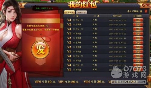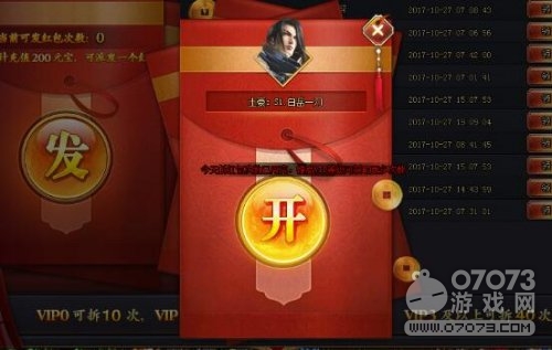 看看我的红包?里面的提示显示,傲天射雕英雄传VIP等级不同获得拆红包的次数也是完全不一样的。VIP0可以拆10次,VIP1可以拆20次,VIP2可以拆30次,VIP3及以上可以拆40次。那么另外一个问题来了,想要成为土豪想要让江湖上的人们认识你,那么你就必须完成200元宝以上的充值。每完成一次200元宝的充值就可以获得1次发红包的机会。想要红包请看右侧,可以领取上面玩家发布的红包,至于奖励多少就全凭运气了。
