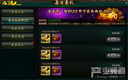 大家都知道激战BOSS会获得海量装备,却不知道还可以获得元宝和进阶丹吧!在每日豪礼活动期间,参与击杀野外BOSS、古墓BOSS、BOSS之家,即可获得丰厚奖励。每当等级提升时也可获得大量的元宝、银币和进阶丹,而且在线时间的长短直接决定了玩家能够获得多少元宝!