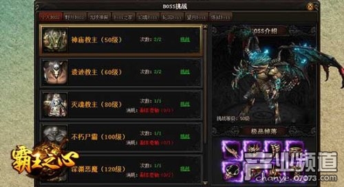 挑战BOSS中的BOSS共分为个人BOSS、野外BOSS、龙陵BOSS、BOSS之家、幻境BOSS、轮回BOSS、望月BOSS、炼狱BOSS八大种类,每个种类中都包含有数量不一的各种大型BOSS。