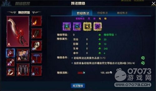 阵法精修需要消耗一定的符文碎片,指定等级需要消耗一定数量的特殊道具——阵法秘鉴。当你达到一定等级时,需要完成指定条件才能继续精修。当全身装备阵法精修平均等级达到指定值时,可激活精修套装,获得额外的属性加成。