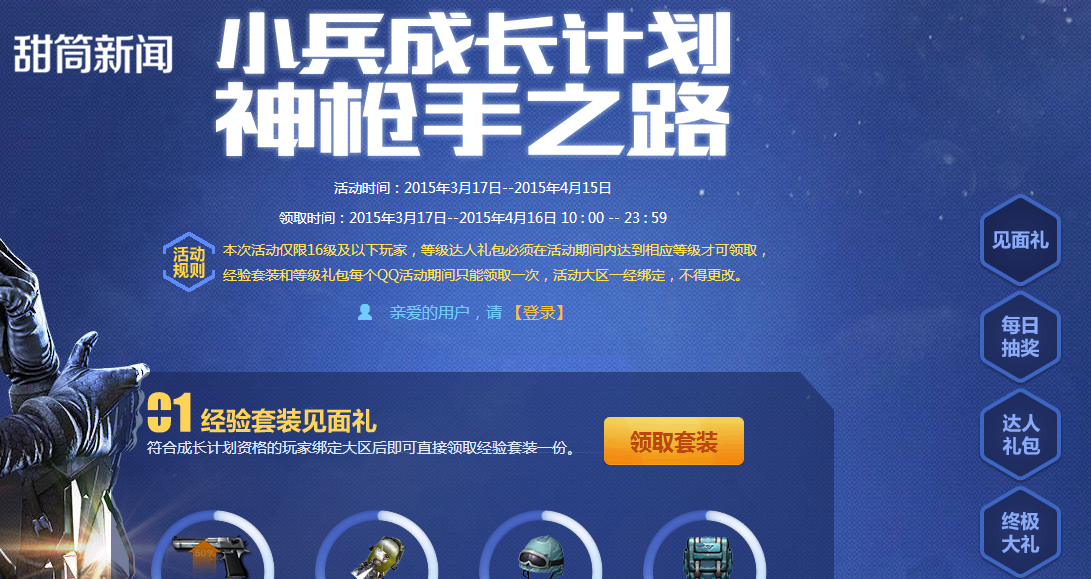 活动时间:2015年3月17日--2015年4月15日,16级以下的玩家绑定所在大区都可以领取经验套装,经验套装包括:经验卡+50%(7天)、 绿光小萝莉(7天)、毁灭都市头盔(7天)、毁灭都市背包(7天)。除此之外,列兵2级≤玩家等级≤15级的玩家来到活动页面即可立即获得脱离笑脸礼包, 且每个QQ号仅限领取一次。