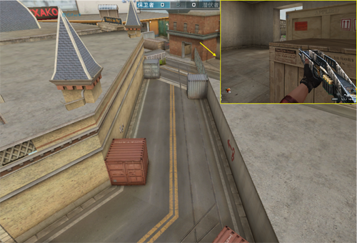 接下来,看一下B大道。整个B大道也就只有四个铁箱,非常的宽。在B 大道的尽头是B仓库,B仓库里边有两个组合箱,如右上角,保卫者一般都是会在仓库架狙卡点的。B仓库旁边就是B包点了。对面如果有几个狙击架点的话,一般潜伏者很难直接从B大道攻进去。