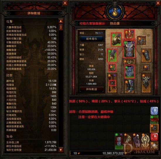 装备上完善的防御词缀,完美无损的减冷却词缀(CDR)应有尽有;技能上所有增伤技能全开。