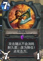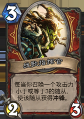 炽炎战斧/奥金斧/血吼 + 血帆袭击者 + 冲锋/战歌指挥官 小斧头配合血帆是战士最好的后手开场组合;奥金斧配血帆则是战士伤害的中流砥柱。 而下面的如果手中之前留有血吼,7+7+2+2=18,是实打实的比赛终结者。 |