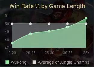 猴子的胜率也是非常单调的随时间增长而提升,猴子后期能力非常强,主要还是得益于其大招团战作用,猴子隐身切入对于后排也是很大的威胁,因此在使用猴子的时候也不必太心急!