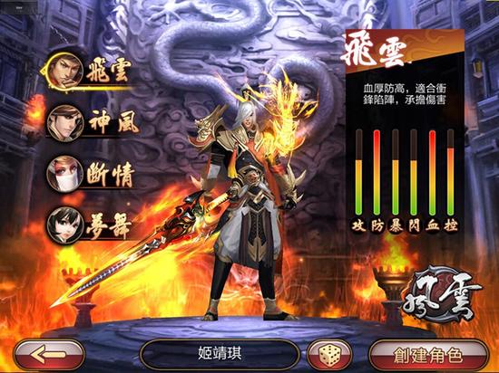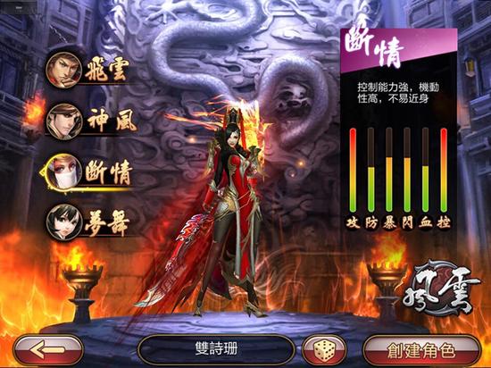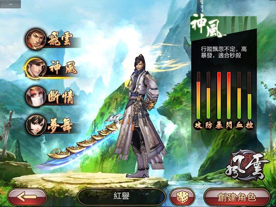 在众多武侠手机版中,由于设计平衡不易,玩家所能选择的职业,及每一种职业的功能特色都受到一定侷限。而在《风云》手机版中,针对职业的设计绝不马虎,一开始开放的四种职业,即拥有RPG游戏中“战、法、牧”的概念,充分展现出每一个职业的独特性,《风云》更为首款移动平台中实现MMORPG正统“战法牧”角色设计之游戏。以《风云》的四大主角步惊云、聂风、第二梦、楚楚为原型,设计出飞云(近战坦)、神风(近战刺)、断情(远程法)、梦舞(远程牧)四种职业,不仅在个人培养上有更多明确的方向,而且在团战方面,各职业也能尽情发挥所长,通力合作越过难关。