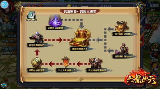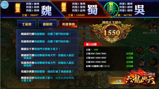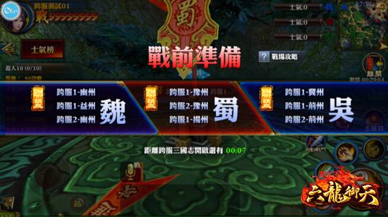 《六龙御天》此次改版跨服三国志活动中分“魏”、“蜀”、“吴”三方势力。三方中每方可进入战场人数有限,会根据角色战力对每方的玩家进行排名,每方战力排名前100的玩家可自由进入战场,其他则以排队进入战场。活动开始后,系统将根据各服各国家的综合国力对各伺服器中的所有国家进行分组、匹配。将会选取国力接近的三个国家为一组进行比赛;国力较低的国家,则会以多个为一个联盟,作为跨服战中的一方参与比赛。