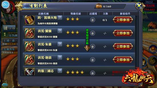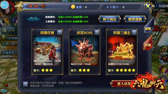 《六龙御天》跨服BOSS玩法在玩家等级达到60级后开启。共有洪荒-饕餮、洪荒-地狼、洪荒-朱雀三大终极BOSS,活动时间分别是每日13:30/19:45、13:30/19:30、13:45/19:30等时段出现,击杀洪荒BOSS后可以获得大量的丰厚奖励。玩家需前往洪荒幻境寻找怪物,在时间快要到BOSS击杀时间时,系统将会出现提示。建议玩家可以点击右上角的小地图,自动寻路提前到指定地点等候BOSS。在路上或打BOSS的过程中,也可能会被其他玩家击杀,请特别小心。若不小心死亡,可以选择完美复活和安全复活。若使用完美复活则需要花费通宝。
