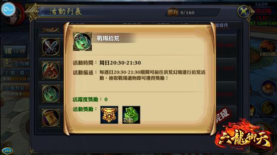 战场拾荒的活动时间在每周日20:30-21:30。玩家在活动期间至洪荒幻境,拾取战场遗物,就可以获得丰厚奖励。游戏中世界会有系统提示活动开启,进入到洪荒幻境后领取任务唷!