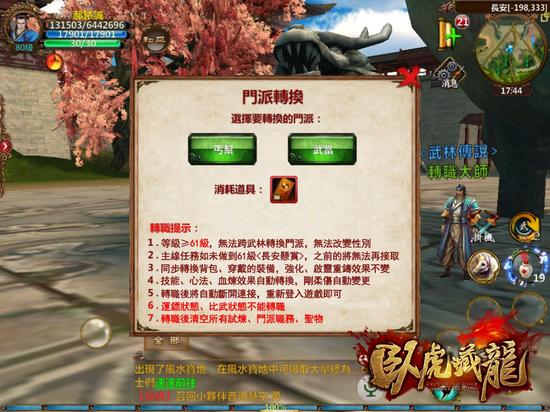 各位大侠们,如果还在为你当初选择职业时没有慎重考虑而懊悔,或者玩过一段时间后想感受新职业,那么请勿错过本次改版开启的转职新玩法。只要大侠等级高于60级(含60级),在长安城大鼎下找到“转职大师”即可使用转职卡立刻转换到同一武林的其他门派。如果在体验过新门派之后觉得还是旧门派更适合你,那么你也可以使用转职卡转回去。转换完成后,穿戴装备和相应的数值均由系统自动调整。如此轻松便捷的门派转换,相信不少大侠已经迫不及待想进行转职体验了吧!