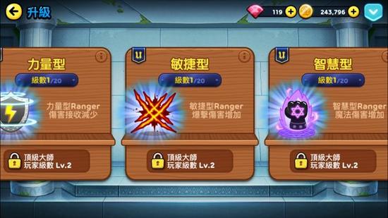在新的改版中,不仅 Ranger 可以进行终极进化,玩家所期待的顶级大师使用者等级也开放升等了!随着等级的提升,可在新增的升级选项中,进行‘力量型’(力量型 Ranger 伤害接收减少)、‘敏捷型’(敏捷型 Ranger 爆击伤害增加),与‘智慧型’(智慧型 Ranger 魔法伤害增加)的升级。