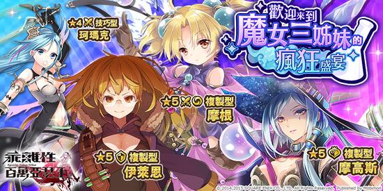 欢迎来到魔女三姊妹的疯狂盛宴!各位亚瑟一同跟魔女们来场PARTY吧!即日起至2016年7月7日维护前,湖中付费转蛋将出现新的骑士卡片,[☆5复制型伊莱恩]、[☆5复制型摩根]、[☆5复制型摩高斯]三张骑士卡片推出!进行转蛋时,抽中UR必为魔女狂宴的系列主打卡唷!