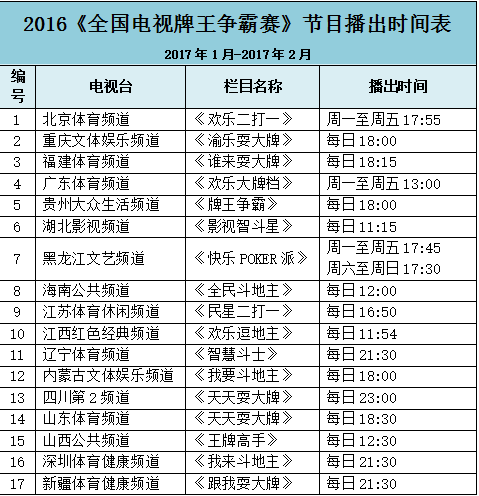 请锁定17个省级电视台收看《全国电视牌王争霸赛》总决赛,精彩不容错过!