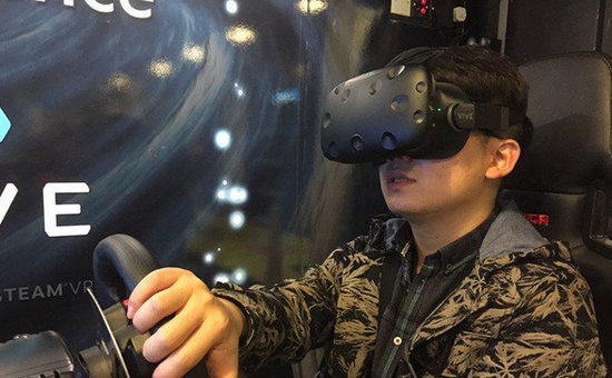 坐落在繁华的旺角商圈,该VR网吧租用了一整层的写字楼,占地约为5000英尺,内设有普通上网区和VR体验区,其中VR体验区被划分成了3块:2个普通Vive游戏体验区和1个VR赛车游戏专用体验区。据了解,这家公司在香港有10多家分店,但目前支持VR体验的只有2家。