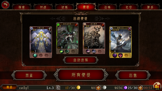 《地狱之门》游戏截图5之卡牌系统因此,在《地狱之门》中,最为重要和核心的不是战斗的操作,而是卡牌的选择和培养。游戏中很有特色的一点是融合了风、火、水、土四种元素,使徒和怪物都归于这四种元素之下,无论是强化,属性技能的释放都与此息息相关。每次战斗上阵的使徒只有四个,游戏中提供了自动选择这一便利方式,但据蘑菇酱观察,自动选择还是以等级为优先,对于使徒的培养有四种方式:技能升级、强化、恶魔之血、突破,前两个无需赘述,恶魔之血简而言之就是吃药对使徒进行单项加成,突破类似于合成,用一张相同的卡片使得使徒能力得到大幅提升,但是星级并不会改变。