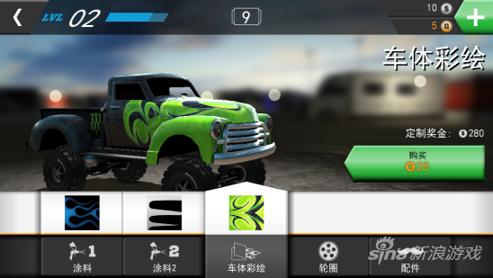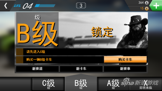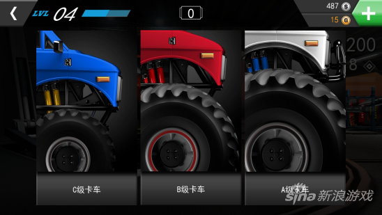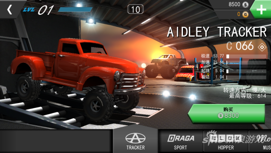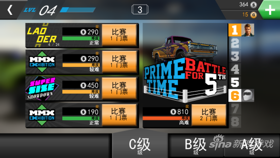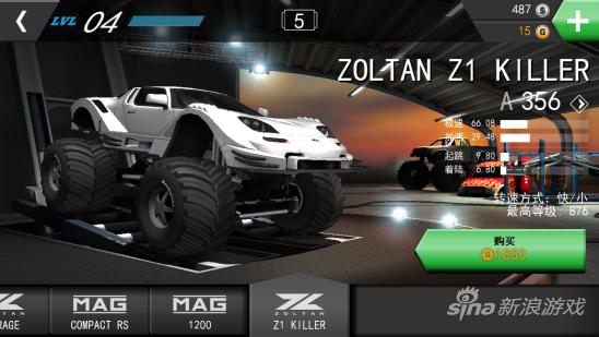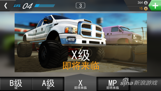 《MMX 大脚车》(MMX Racing)游戏图片9《MMX 大脚车》(MMX Racing)中的车辆虽然不够豪华,但是都非常精美,目前分为A,B,C三档,每档车对应相应赛事,奖金也会有所不同,玩家必须利用最开始人手一台的C档车参加比赛赢取银币来购买新车,同时银币也需要用来升级自身属性,游戏中银币虽然得来的挺快,但是消耗速度也很快,性急的玩家只能付费购买金币或是银币了。