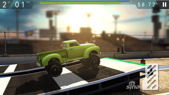 《MMX 大脚车》(MMX Racing)游戏图片4在游戏中玩家仅需掌握3个操作,比赛开始前轻触屏幕在适当的时机让赛车的起跑速度完美,开跑后遇到绿线车会腾空,腾空的瞬间松开油门,而落地时又要适时的踩下油门,整个过程只有屏幕右下方的油门参与,游戏的操作门槛非常低,但是要想每次开跑,起跳,落地都完美真的不是件容易的事情,最后的奖金都会根据比赛过程中大脚车的表现来定夺。