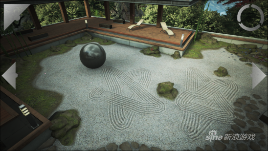 《禅境花园》游戏图片4《禅境花园》有着232MB的安装包,但它所表现的全部内容你可能用五分钟就可以仔细体验完。进入游戏后会屏幕上会出现点击开始的选项,展现在眼前的是一片很有现代艺术气息的庭院,清幽恬静,耳机里传来阵阵鸟鸣,潺潺流水声,仿佛置身在山谷之中,这时你会发现游戏中有三个不断跃动的小白圈,点击左边之后视野豁然开朗,跟随快速移动的镜头你会发现原来这栋别样的庭院建造在一个个悬在空中的山峦之中,一丝仙气便萦绕于现代风格的建筑周围。