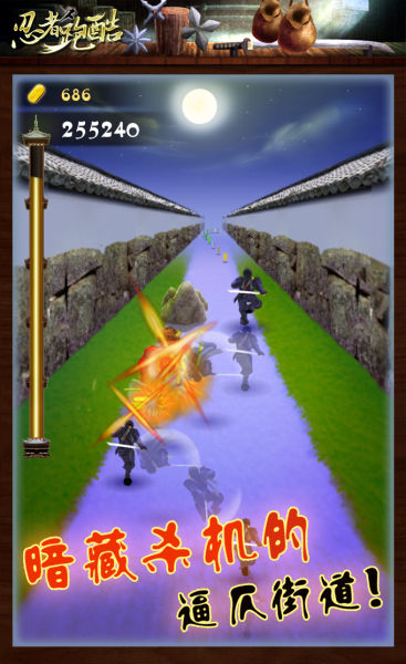 顾名思义,《忍者跑酷》是一款以日本江户时期忍者仇杀为背景的跑酷游戏,它抛弃了跑酷类游戏单一的“闪避”玩法,玩家扮演的忍者在充满危机的道路中不断前进,除了避开沿途的陷阱,还需要通过手中的武器解决掉出现的敌人。游戏采用纵向的画面视角,直线式的前进方式让玩家减少操作,从而把注意力更多的集中在发现敌人、干掉敌人的节奏上,简单直接的暴力玩法让人大呼过瘾。