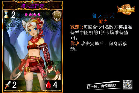 兽人卡牌大多数猫人类卡牌都拥有伏击能力,进入战斗后攻击力翻倍,部分猫人还拥有减速、破甲的能力。猫人类卡牌属性均衡,攻击力高,生命值较低,属于爆发行卡牌。