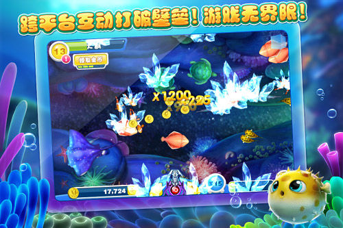 《捕鱼达人2》新版中iOS和安卓平台玩家不再遥遥相望,通过新浪微博账号,首次实现平台数据互通。玩家只要使用新浪微博登陆游戏,iOS和安卓平台玩家的成绩将出现在同一排行榜上,两个平台的玩家可以打破限制,同台竞技,共享这场深海捕鱼大战。