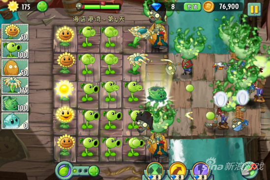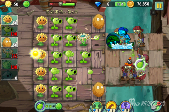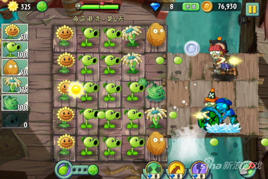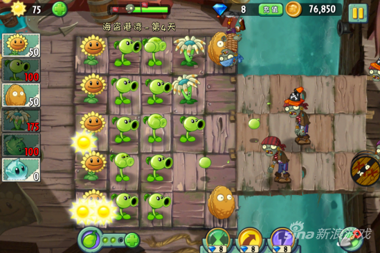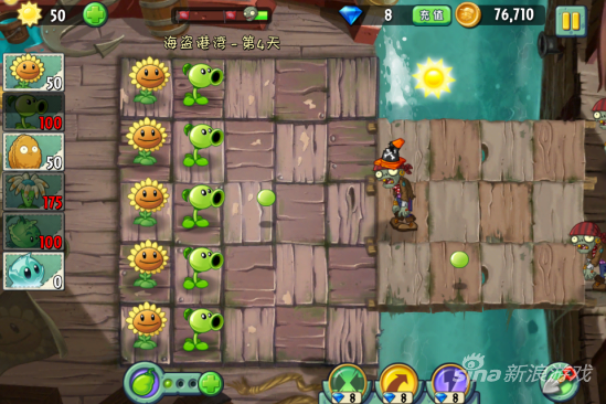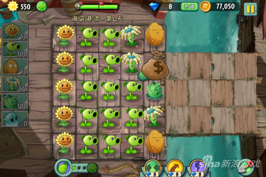 这一关我们还没得得到弹簧豆所以要加大火力,因为会有木桶僵尸出现的,是比较耐打的。首先种满向日葵是必不可少的步骤。