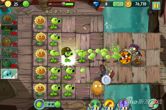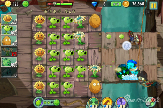 在这一关中攻击力不足的时候就得使用多种植物一起来对付了,对付木桶僵尸最好的其实是用弹簧豆弹飞,或者用地刺来破坏他的木桶,但是我们目前都没有,那只能加大攻击的力度了。一起来看图吧!