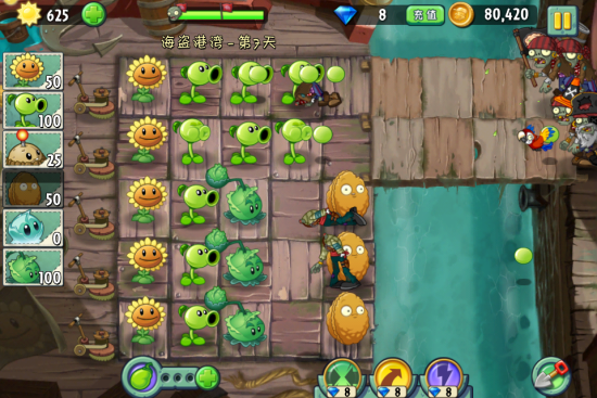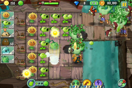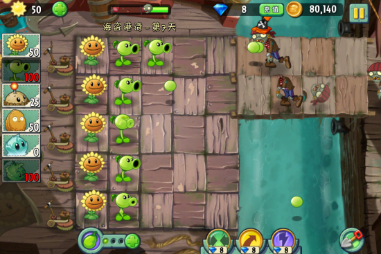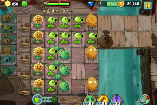 现在我们来到海盗港湾第七天,在这一关中,前两排的僵尸会比有海岸的这三排多,所以首先布局植物要先摆在前两排,然后我们打常规赛就可以了。足够的阳光足够的攻击植物。好了这里付截图。
