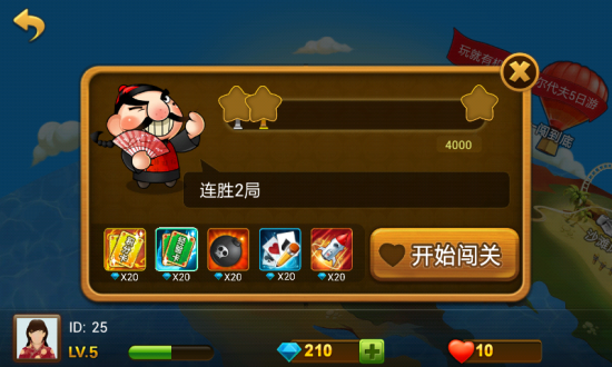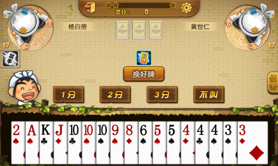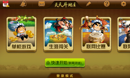 开始闯关此外,新的《单机斗地主》在画面上也进行了优化:全新绘制的场景画面将给玩家带来更多视觉上的享受,高清画面堪称媲美PC版;同时在操作上针对触屏的特点做了一系列改进,更对移动网络进行了全面升级,即使在使用移动/联通/电信的2G网络时也能保证无掉线无延迟,让玩家随时随地乐享游戏!