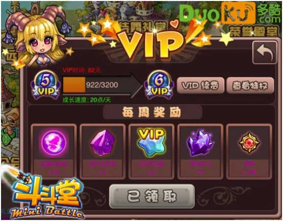 VIP等级奖励除了能够享受第三次副本翻拍的折扣优惠外,玩家还会根据VIP等级获得相应的开启幸运星的次数,VIP每周可领取一个豪华礼包,并且拥有专属任务。小小VIP,大大的惊喜!
