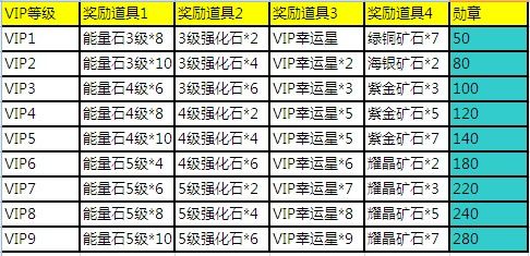 每周奖励VIP,不仅代表尊贵的身份,还代表特别的享受,专属的VIP等级特权。玩家可以通过充值获得VIP。随着VIP等级的提高,在杀敌过程中将获得更多经验和功勋加成,并会提升强化的成功率,额外加成让升级更快。同时,战败后的损失也减轻,达到VIP5时,战斗失败不扣功勋。常年战斗在最前线的玩家,亦不用担心战败后一无所有!