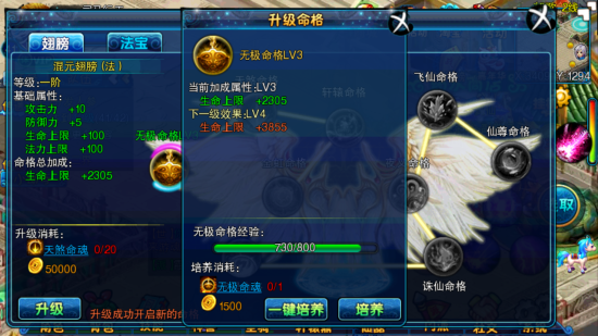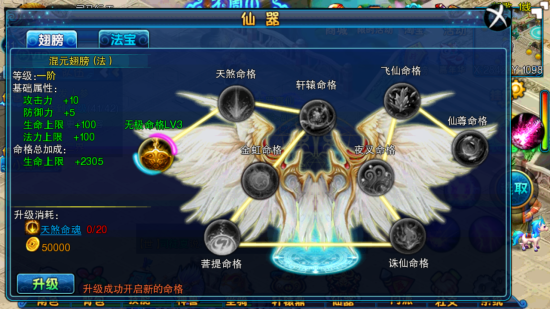 《仙变》“仙器”中的翅膀集华丽实用于一身。混元翅膀不仅可以通过升级还提高属性,激活完善“命格”也是重要的成长方式!随着命格等级的提升,属性也不断增强,翅膀升级后可以激活下一“命格”得到新的属性。如一阶翅膀能培养“无极命格”增强生命上限,当翅膀升级二阶就可以激活“天煞命格”的到新的属性。升级翅膀需要的命魂大多出自每日活动“九重天”每层通关礼包和每九层的通关翻牌奖励。
