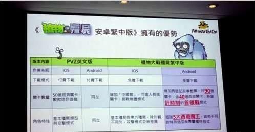 伴随着《植物大战僵尸2》推出,PopCap(宝开)游戏公司也迎来了自己的第二春,为了更好的开拓游戏市场,近日PopCap公司的公关部门来到台湾,为了开拓当地游戏市场,PopCap和当地的MIMIGIGI(秘密基地)合作开发了一款Android游戏《植物大战僵尸繁体版》,并且在该游戏中加入了独特的西游记模式。