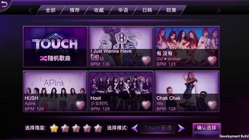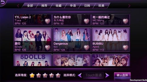 张根硕、徐仁英、东方神起……众多亚洲巨星的知名作品都能在《TOUCH》中找到,让他们的知名歌曲为你的精彩舞蹈进行伴奏,走在流行音乐的前端。选择歌曲的同时,还可以通过屏幕左下角的星星选择你所擅长的难度,星星越多,难度越高,如果选择了不适合的难度,会让你跳得手忙脚乱的。