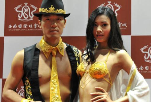2009年6月26日,重庆南坪国际会展中心,一对模特身着价值400万用纯金打造的黄金内衣、领带、腕带正在走秀。不知道冬天该如何解决,难不成要穿皇帝的新衣走在大街上么~