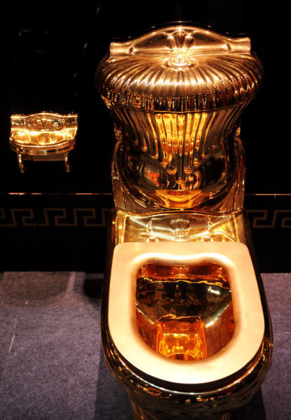 2008年1月19日至20日, 深圳国际顶级私人物品展登录深圳会展中心。图为纯金马桶亮相。如此豪华的马桶会放在厕所里,相信很多男人都会坐着小便了……