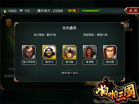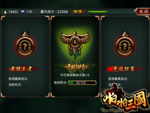 与天下英雄决战竞技场游戏中当玩家战斗力达到3600(壮士6级)竞技场就会自动向你敞开大门。竞技场具有5等级分为:青铜、白银、黄金、大师和至尊,每个等级中分成9个段位。所有玩家刚进入《啪啪三国》竞技场都会处在青铜1段,玩家只有通过不断的切磋才能提升竞技等级并积攒竞技积分。当积分达到120点时,表明你已经跻身高手之列,同时进阶赛模式也同时开启,更强大更智慧的对手等着你来挑战。