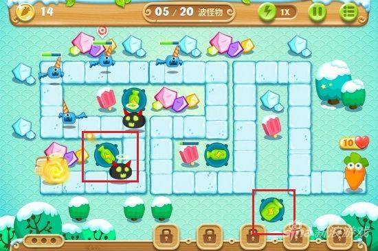 《保卫萝卜2》雪地主题第3关本关地图初始有一个炸弹星炮塔,玩家可以升级至顶级,选择清除其上方的树木道具,还要兼顾消灭来袭的怪物。然后在地图中所示位置安装一个便便炮塔。待炸弹星上方的树木清除后,安装第二个炸弹星,选择清除其周边的道具。接着在地图中间堡垒左边安装第三个炸弹星,并逐渐升级至顶级。