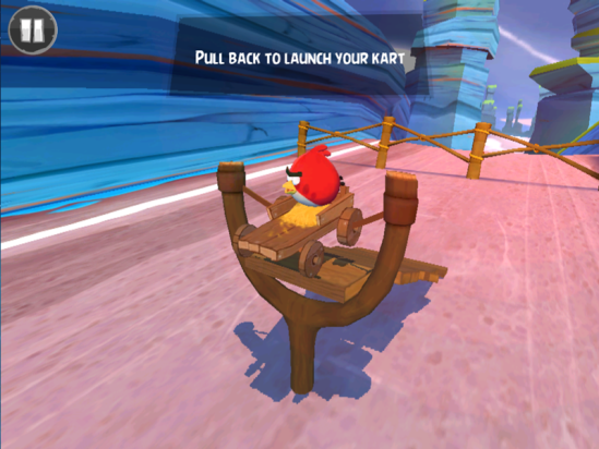 教程关卡结束之后,就要开始游戏啦!这款游戏的起跑方式非常特别,小鸟和猪猪们都坐在弹弓发射台,玩家要像玩《愤怒的小鸟》那样拉动弹弓将小鸟和车子一起弹射出去。