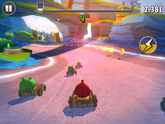 然后小鸟和猪猪们就开始向前狂飙了,和其它卡丁车游戏一样,路上也有金币和加速带,游戏没有小地图的提示,不过赛道并不复杂而且只有一圈,玩家只要控制好拐弯就行了。屏幕上方显示了车手的位置和距离终点的远近,右上角还有一个闪电加速道具可以免费使用一次,在后期关卡中可以通过金币购买多次使用。