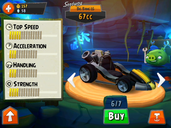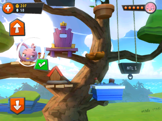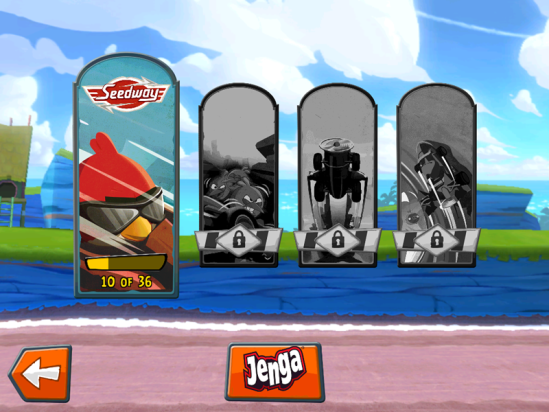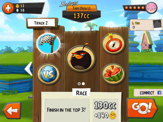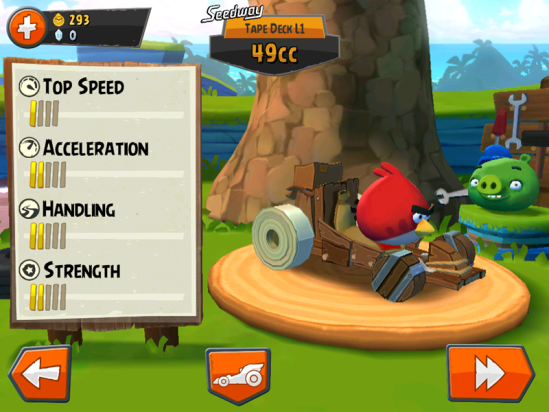 还有一点令人蛋疼的地方,就是在游戏里引入了体力值系统,右上角会有5格体力。角色没比赛一场就会消耗一点体力,体力耗尽之后就只能等待恢复了。不过你还可以返回赛车升级页面,点正中心的小鸟图标按钮,选择挑战成功的其他角色继续比赛。