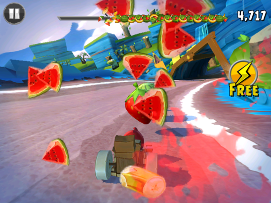 和其它赛车游戏一样,《愤怒的小鸟卡丁车》也提供了5种比赛模式,除了常规赛、计时赛和对决赛之外,还有非常有趣新颖的水果撞击赛和BOSS挑战赛。在水果撞击赛的跑道上有着一排排诱人的水果,西瓜、草莓和香蕉.。.玩家要做的就是驾车撞上去,水果们被撞的粉碎溅得满屏都是,这里比的不是速度,而是在到达终点之前撞烂足够多的水果。