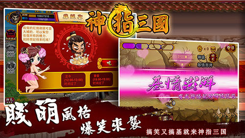 《神的指意》采用的是独特的剪纸风格,虽说创意十足,但是相对小众的风格还是阻挡了一部分人的热情。这次《神指三国》则完全摒弃了原来的风格,加入时下流行的元素“恶搞卖萌,基情无限”!贱萌风格+简单玩法可谓真正做到了老少皆宜!男女通吃!