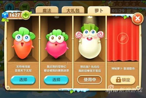 手拿两个棒棒糖的白萝卜白白胖胖的萝卜手拿两只棒棒糖,这不是普通的棒棒糖,它们可以魅惑凶悍的怪物,抵御怪物的两次侵袭。萝卜受到的前两次攻击就是失去手上的两个棒棒糖。这样一来,就相当与多了两颗红心。当然了,追求完美的玩家,连棒棒糖都舍不得让怪物夺走呢!