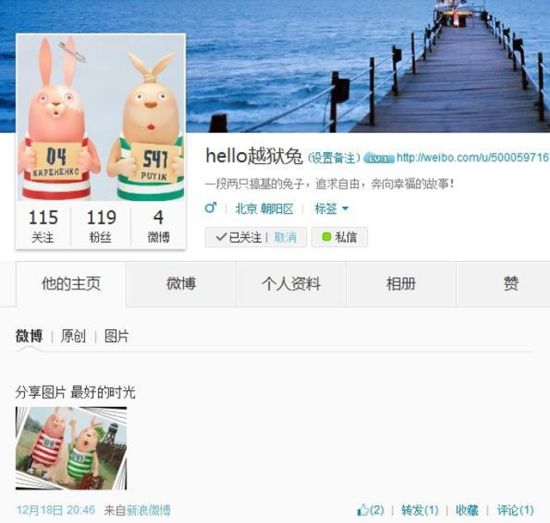hello!越狱兔还记得动画片《监狱兔》里的普京吗?这次他不仅是越狱还做了更“惊险”的事情,他不怕死的背着基里连科开通了属于他们的微博,记录这他们之间点点滴滴的幸福和啰啰嗦嗦的吐槽。可谓是言语间都是满满的情意哦!