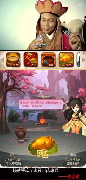 “一饿就虚了,来块XXX吧”,饿货”的走红源于某巧克力颇具趣味性的广告创意,网络上对“饿货”有这样的定义:饿货,常态下无异于常人,人兽无害。饥饿时,IQ直线下降,严重者呈现负值,并常伴有非人类的坑爹、坑朋友、坑兄弟举动。请大家留意身边的饿货人群,奔走告知 。提问在《大掌门》中饿了该么办?答案是少侠快去吃叫花鸡!